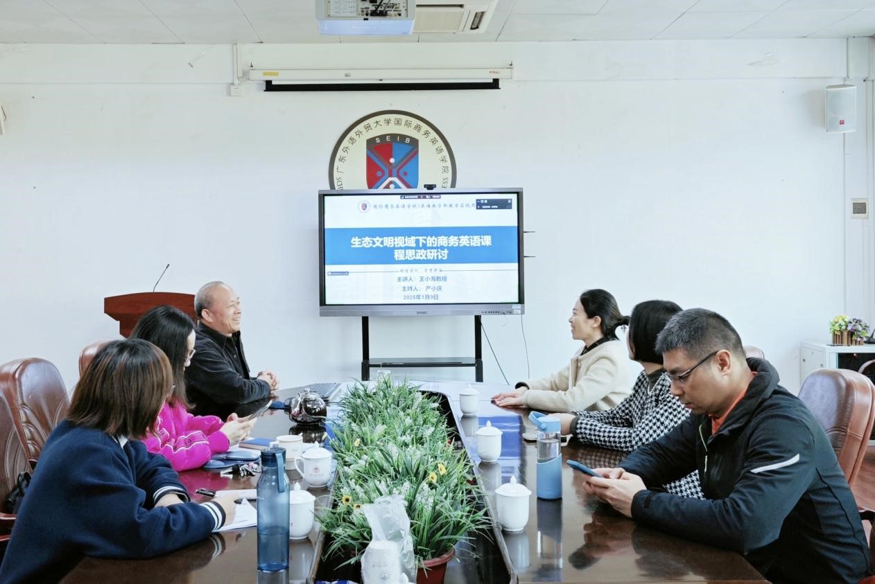 为推进课程思政建设,提升人才培养质量,2025年1月9日下午,太阳成tyc7111cc英语教学部在3教318会议室举行了商务英语课程思政教学实践周教师教研活动。活动邀请我系即将赴任埃及艾因夏姆斯大学孔子学院院长的王小海教授做了题为“生态文明视域下的商务英语课程思政”的讲座。活动由英语教学部主任严小庆主持,英语教学部和国际商务系部分教师参加。