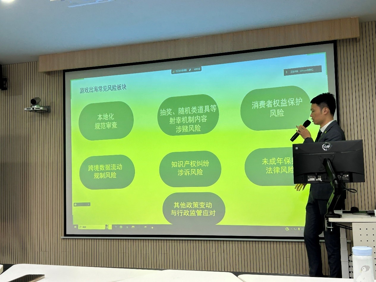陈律师特别关注了中国自主研发移动游戏出海,分享了其海外重点市场地区占比、海外市场收入前100类型占比,并以国际游戏市场热点法律事件作为切入点探讨了游戏出海常见风险板块、法律服务流程、重点法律服务环节、尽职调查服务清单、监管重点及规范趋势,以及规范趋势重点板块:本地化规范审查、抽奖、随机类道具等射幸机制内容涉赌风险、消费者权益保护风险、跨境数据流动规制风险、知识产权纠纷涉诉风险、未成年保护法律风险,以及其他政策变动与行政监管应对等。